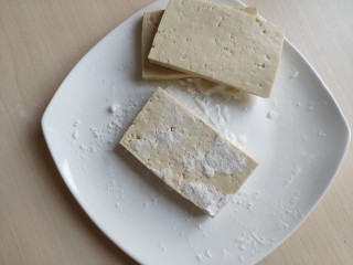 往切好的豆腐块上撒少许玉米淀粉,个人觉得这样煎好的豆腐吃起来更嫩滑。不喜欢加淀粉的这部略去。