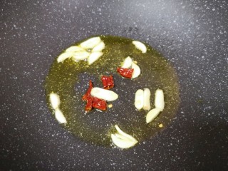 炒锅内倒适量的食用油烧热,下入蒜片和干红辣椒炒香。