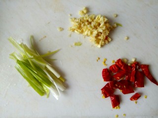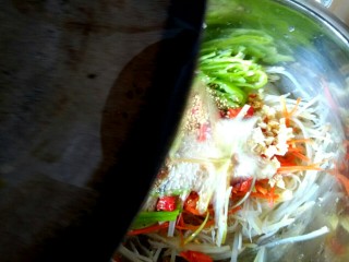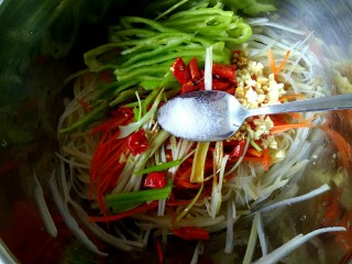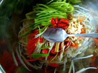 把土豆丝胡萝卜丝控干水份放入盆中 加入尖椒丝,加入葱蒜干红辣椒