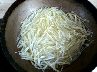 锅中放入适量清水烧开,放入土豆丝,烫至土豆丝变透明即可捞出,不要太软
