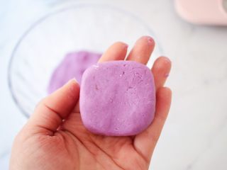 取30克紫薯揉圆,压扁,再把四边压成方形状