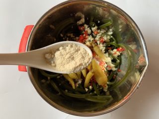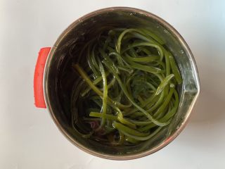 起锅烧水,水开后放入浸泡过的海带丝,盖上锅盖煮约3分钟