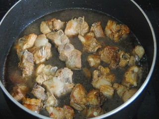 倒入没过排骨一半的清水,盖上锅盖焖煮10分钟;