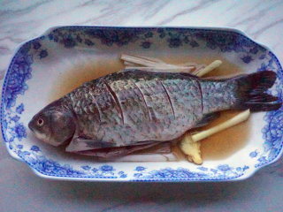 用葱白、姜片、、盐腌制鱼,码味去腥,时间15分钟左右 叨叨叨:鲫鱼表面用刀划斜刀,便于入味