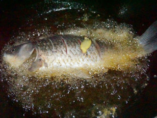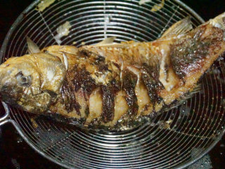 鲫鱼炸至金黄后,捞出待油温升至8成时再下入锅中复炸一遍 叨叨叨:复炸就是炸两遍,这样炸出来的鱼外酥里嫩