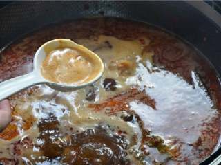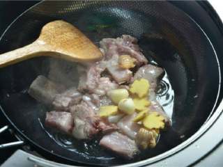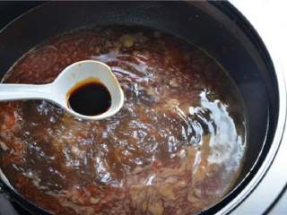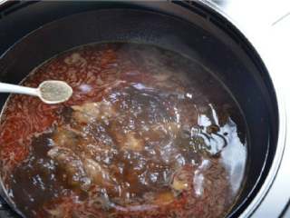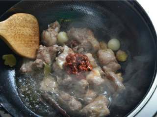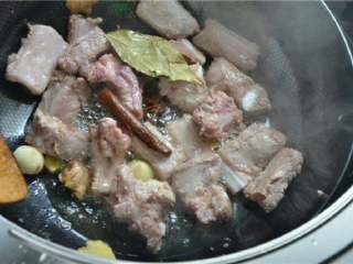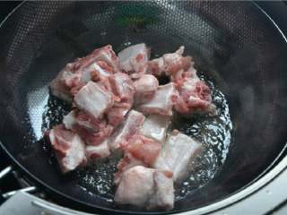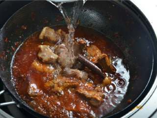 等炒出红艳的色泽之后,倒入清水,没过排骨就可以了。