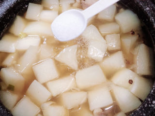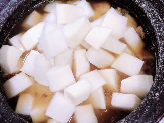 放入白萝卜,盖盖儿继续小火炖煮20分钟。