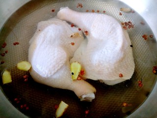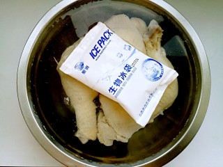 将煮好的鸡腿立刻捞出,用冷水冲凉,再放入冰水中浸泡。
