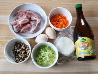 、洗净后切小块,一起放进料理机里绞成肉糜,再加入苹果醋、、、适量盐顺时针搅打上劲;
