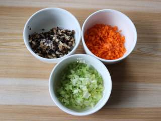 香菇、胡萝卜、芹菜里分别撒少许盐搅拌均匀静置十分钟,待出汁后挤掉汁水;