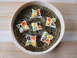 四喜蒸饺是中国一道特色的传统名点,不仅颜色鲜艳多彩,名字也寓意喜庆的意思。看起来这么精致的小点心,你会舍得入嘴吗?