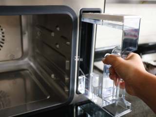 将西屋蒸烤箱的水箱里灌上纯净水,再放回原位,这个水箱的最大容量是1450ml;