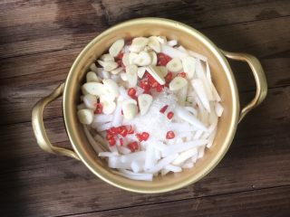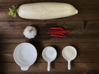 食材准备: 1根 5瓣 小米辣5根 白米醋50ml 10克 食用盐20克 清水适量
