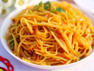 放入胡萝卜丝和辣椒丝煮一分钟,然后捞出沥干水。和土豆丝一起放入盆中备用。