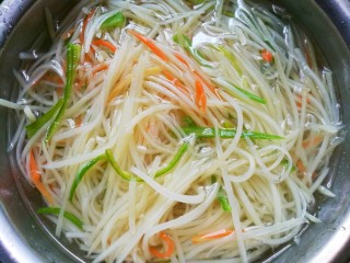 锅内烧开水,放入土豆丝,煮至变色。捞起土豆丝沥干水分,放入凉开水中浸泡,几分钟后拿出沥干水分。
