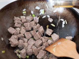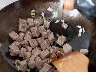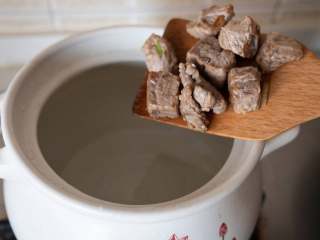 砂锅放足量水,水热后,放入炒香的牛腩。