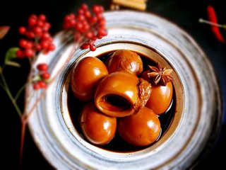 10.煮好后在酱油汤中浸泡一夜,第二天取出酱油蛋,色泽非常红润发亮,酱香味十足。