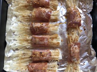 取一小撮金针菇,用培根卷紧,再别一根牙签
