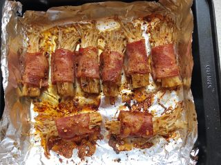 - 烤盘上的锡纸有点粘金针菇,一定要把靠近烤盘边缘的金针菇都刷上料汁,这样防粘