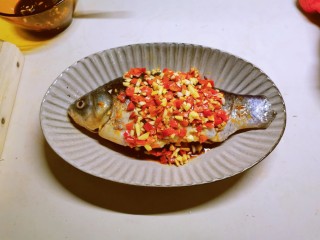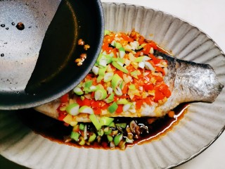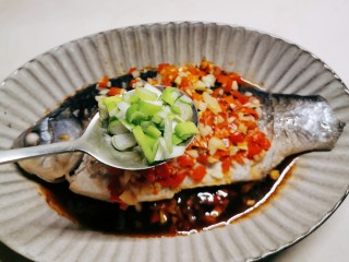 将煎好的鱼放到葱片上面 淋上调好的剁椒料汁
