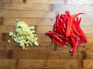 去掉辣椒籽,清洗干净,切成辣椒丝,去皮清洗干净,切成姜末待用。