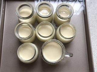将静置好的布丁液倒入模具,8分满,烤盘里加温水。