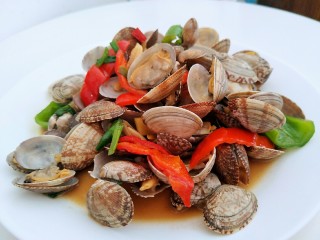 爆炒花甲是一道快手小炒,在广东上至星级酒店,下至街边排档,都能点到这道菜,可想而知这道菜有多美味。 爆炒花甲,炒的花样可以变换无穷,可用金不换、豉汁、黑椒、紫苏、甚至韭菜花来炒,但最平常就是用姜葱来炒,我喜欢再加一点青红辣椒,这样不仅颜色漂亮,添点辣味,味道更是不用说了