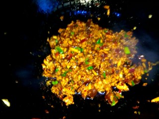 把香菇肉沫铲到一边,放少量植物油,放入一勺炒出红油
