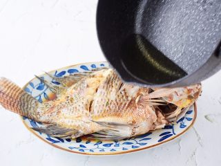 取出夹掉葱姜蒜,倒掉蒸鱼里的汤汁,就是这一步不可省略,一定要倒掉,因为鱼的腥味都在这汤汁里。然后再淋入蒸鱼鼓油