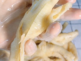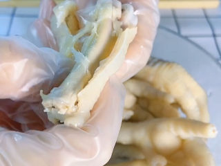 鸡爪煮好后立马放进冰水里浸泡,也可以入冰箱冷冻半个小时,这样会更方便后面脱骨