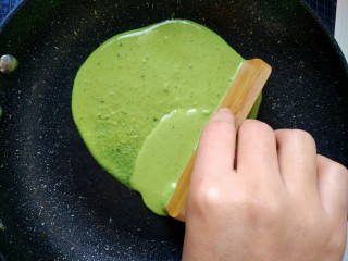 用小竹片,或者铲子,刮匀。面糊流动性很强直接转锅也是可以的.
