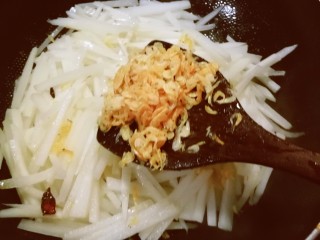放入萝卜丝和虾皮。