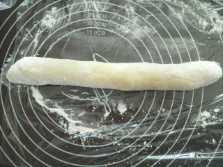 面团从冰箱取出来,在案板上洒上手粉,将面团揉成长圆筒型。分成若干等份。