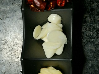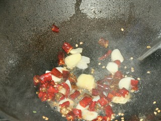 锅中油热后放入姜、蒜片和辣椒爆香。