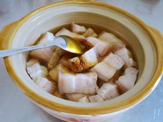 在放入五花肉,填上适量的水。 适量就是刚好和肉平齐, 如果不是砂锅这个水量可能就不合适了,在结合实际情况来调整!放入和。