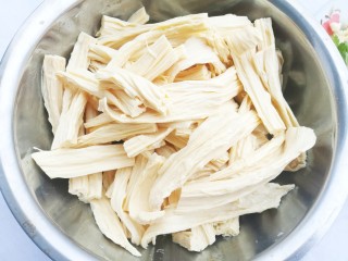 准备材料:450g、半根、15颗、适量、适量。取适量的腐竹放入盆中,倒入30-40度左右的温水没过腐竹,加入一勺食盐浸泡20分钟。
