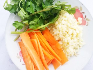 胡萝卜切片,大蒜切末,香菜适量。