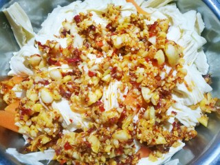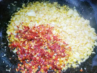 另起锅倒入食用油,油温六成热时,放入大蒜爆香。