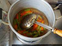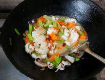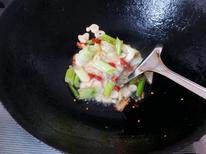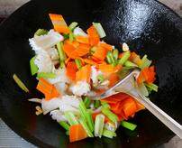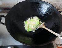 炒锅加色拉油烧至五成热,先投入葱段、蒜片爆香