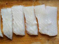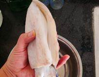 躯干从边缘剪开,取出骨头、内脏和墨囊,撕去表皮,内外清洗干净