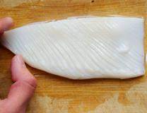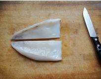 先将墨魚躯干纵向分割成5cm宽的长片,内侧向上横放在砧板上