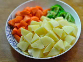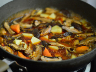 再放入土豆、胡萝卜、香菇,大火煮开后小火焖煮20分钟