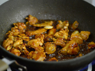 煎至两面焦黄后放入姜蒜,翻炒出香味