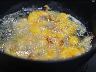 油烧至七成热,把虾放进去,转中小火炸熟。