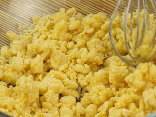 100g分次倒入适量蛋液,搅拌至颗粒均匀无干粉状态(留下部分蛋液备用)