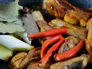 加入大葱、八角、桂皮、香叶、小米椒,炒出香味。