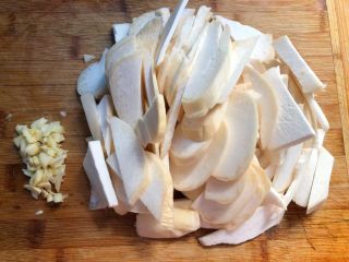 清洗干净,切成薄片,蒜去皮洗净切末待用。