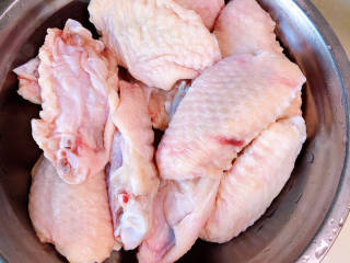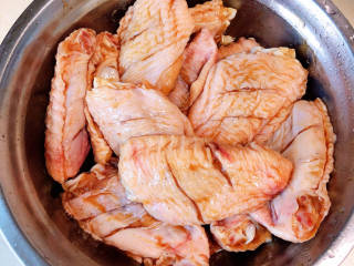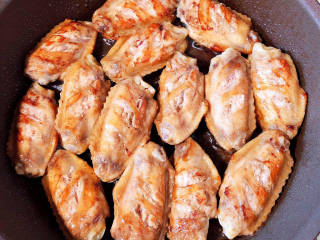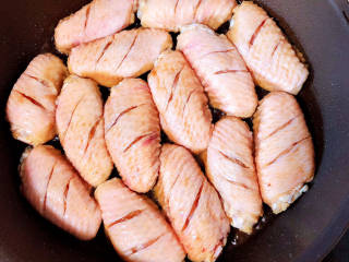 锅中倒入油,加热至五成热,将鸡翅摆好,大火儿煎至金黄。