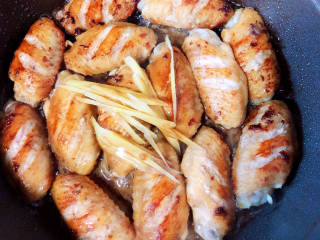 煎好鸡翅,放入丝,倒入腌鸡翅的料。