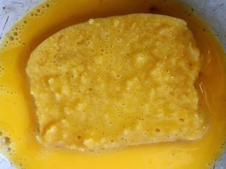 馒头片放入蛋液中两面均匀裹上蛋液